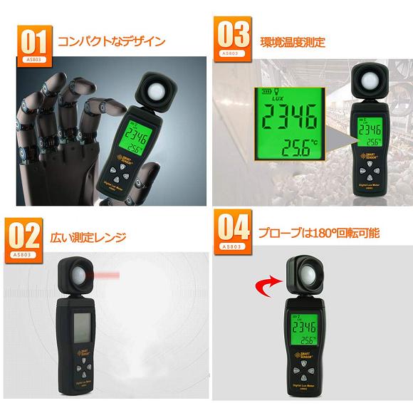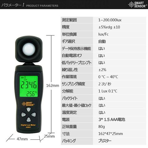 新品型番:AS803 CE準拠 CEマーク、ISO9001マーク付 製品特徴: メーカー:ISO9001認証企業香港SMART SENSOR社製 センサーが360度回転可能、より多角的に測定光源を受け取れます。 大画面バックライトのLCD 温度センサー付 リアルに正確測定、幅広い測定範囲、簡単便利 自動測定機能、測定反応が早い 最大値測定 最小値測定 データホールド 機能 バックライト(消すことが可能) 自動オフ機能(解除可能) 測定範囲 1-200,000 LUX 0-186,806Fc -10−50℃ 分解能: 1Lux (0-9999) 10Lux(10000-99999) 100Lux(100000-20,0000) 精度: ±4%rgd±10 (<10,000LUX) ±5%rgd±10 (>10,000LUX) 最大値測定 最小値測定 データホールド 機能 バックライト(消すことが可能) 自動オフ機能(解除可能) サンプリング回数:2回/秒 再現性:±2% 使用温度 0-40℃/10RH%-80RH% 電源単4電池3本使用 テスト電池(同梱) H160×W50×D28mm 107g 説明書:日本語。 すべての商品は全動作確認の上、出荷するため、不良品はありません。 商品は輸入品のため多少の傷などがある場合がございます。気になさる 方は入札をお控えください 価格消費込:2348円見積 注文 |